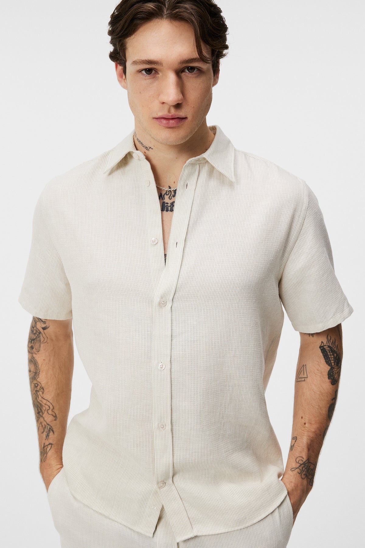 Elevate your summer wardrobe with our Lund Linen Mix Shirt, a versatile wardrobe essential crafted for summer sophistication. Crafted from a unique blend of polyester, linen, and wool, this shirt offers a luxurious feel and breathability, perfect for warmer days. Adorned with textured stripes, it adds a touch of contemporary flair to any ensemble. Pair it with our Noah Wide Pants for a coordinated look.- Matches Noah Wide Pants